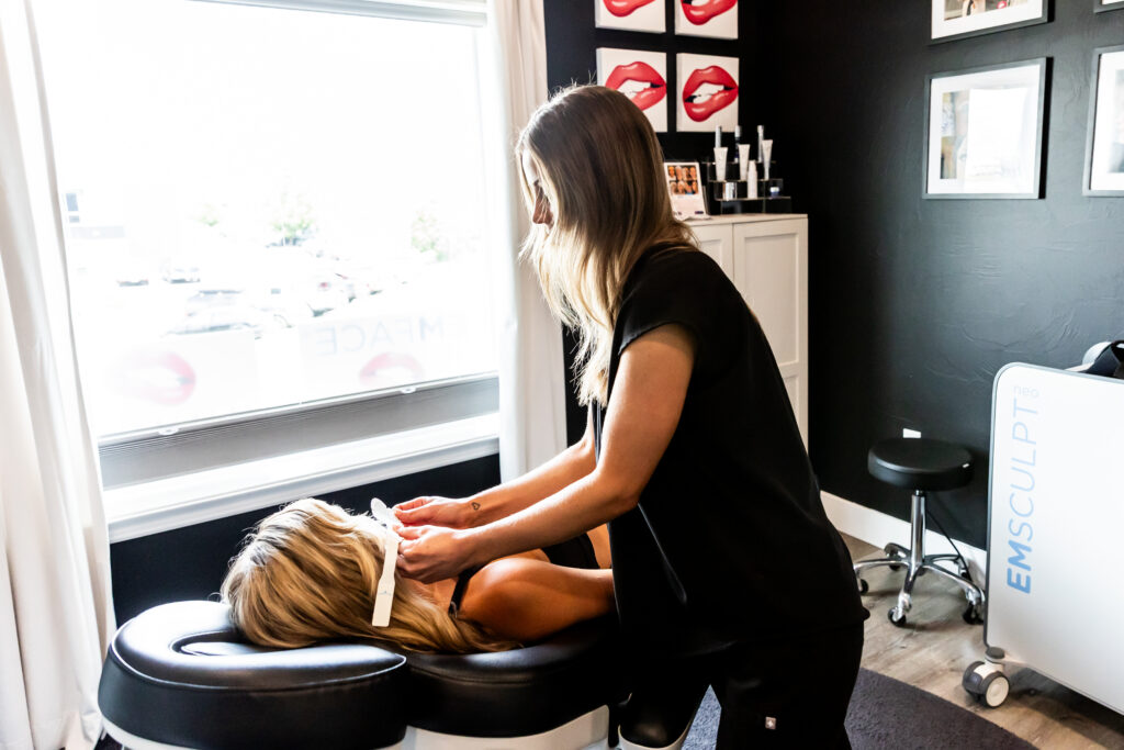 EMFACE in Bozeman is an appropriate treatment for women in their 30’s and beyond. It not only significantly tightens and lifts, but it is suitable for those looking to be proactive and preventative when it comes to their own aging concerns. Many clients report lose or hanging skin, sagging jowls, and facial tissue that doesn’t look or feel tight and toned anymore. EMFACE’s powerful technologies target tissues deep, beyond the skin’s surface. It strengthens connective tissue, improves muscle density, tightens the SMAS layer (the fibrous network below our skin’s surface), 40% wrinkle reduction, lifts everything from the collarbone up, 30% increase in muscle tone, 26% increase in collagen, 200% increase in elastin, pore size reduction, improves pigment irregularities, and minimizes the amount of Botox and filler injections.